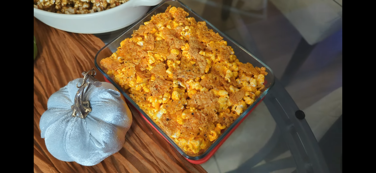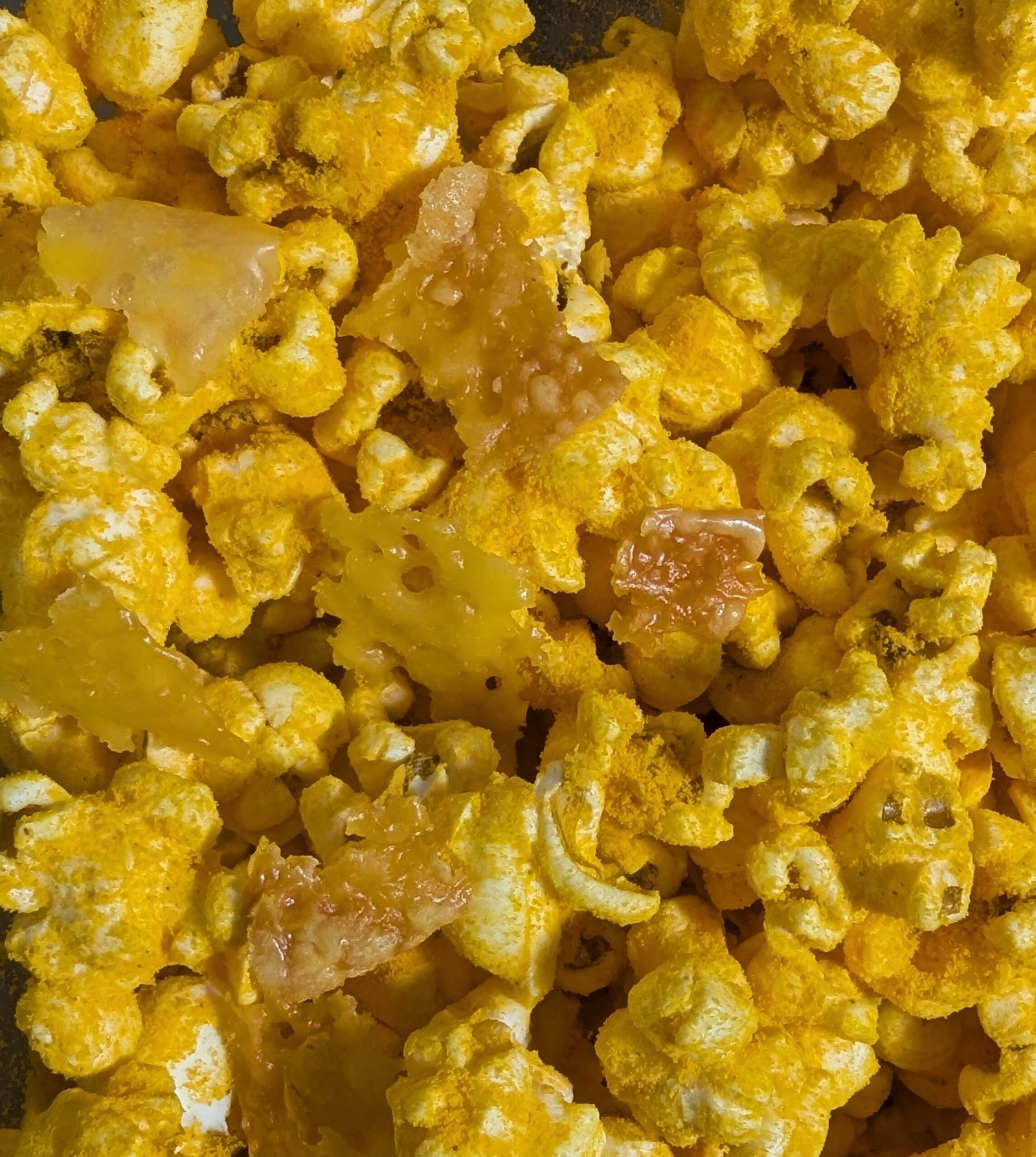 Non-GMO Popcorn Kernels, Refined Coconut Oil, Baked Cheddar Cheese Chips (Pasteurized Milk, Cheese Culture, Salt, Enzymes, Annatto Color), Cheese Powder [Cheddar & Blue Cheese (Pasteurized Milk, Salt, Cheese Cultures, Enzymes), Whey, Palm Oil, Salt, Whey Protein Concentrate, Lactose, Maltodextrin, Lactic Acid, Citric Acid, Yellow 5, Yellow 6], Spices (Garlic, Onion, Black Pepper, Cayenne Pepper, Paprika), Nutritional Yeast, Salt.